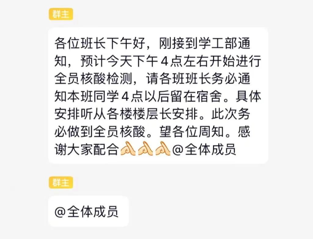 有了前几轮核酸检测的经验,本次,学校 总结经验、科学谋划,科学调度, 以学生公寓楼为单位,按楼宇、楼层、宿舍为单位开展检测,由各宿舍长负责清点,楼层长、公寓辅导员负责协调,统计参与核酸检测的人数, 秉持着绝不漏掉一个人的原则,科学调配,节省时间,大大缩短了检测时间。