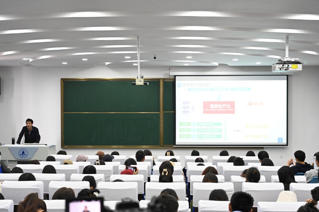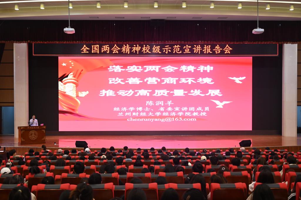 学校全国两会精神宣讲工作中,针对不同学科专业师生群体,安排相应的宣讲专家和有针对性的宣讲内容,切实推动全国两会精神入脑入心。3月23日、29日,省委宣讲团成员、现挂职庆阳市西峰区委副书记、我校统计与数据科学学院院长、博士生导师黄恒君教授就新质生产力和人工智能相关内容作了2场专题宣讲;4月2日,省委宣讲团成员、经济学院陈润羊教授作了“学习全国两会精神 改善营商环境”专题宣讲;4月9日,省博士宣讲团成员、法学院副院长杨利华教授作了专题宣讲;4月19日,省博士宣讲团成员,经济学院教授、学校教师发展中心主任赵永平教授作了“新质生产力推进经济高质量发展”专题宣讲。几位专家的宣讲分别针对不同的学生群体,结合受众学生的学科专业特色进行了分众化、全覆盖的理论宣讲,紧密结合学校各学科特点,对教学科研、求职就业、服务社会等都具有重要的参考价值,有力地彰显了理论宣讲的实际效果。学校融媒体中心制作全国两会精神系列宣讲视频,通过线上平台传达全国两会好声音,营造了学习、宣传、贯彻的浓厚氛围。